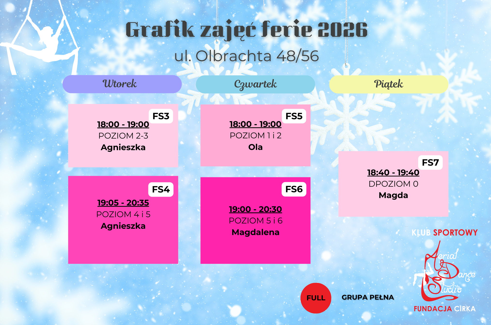 FS6 – grupa przeznaczona dla młodzieży i osób dorosłych kontynuujących naukę na szarfach na bardzo zaawansowanym poziomie (ul. Olbrachta)