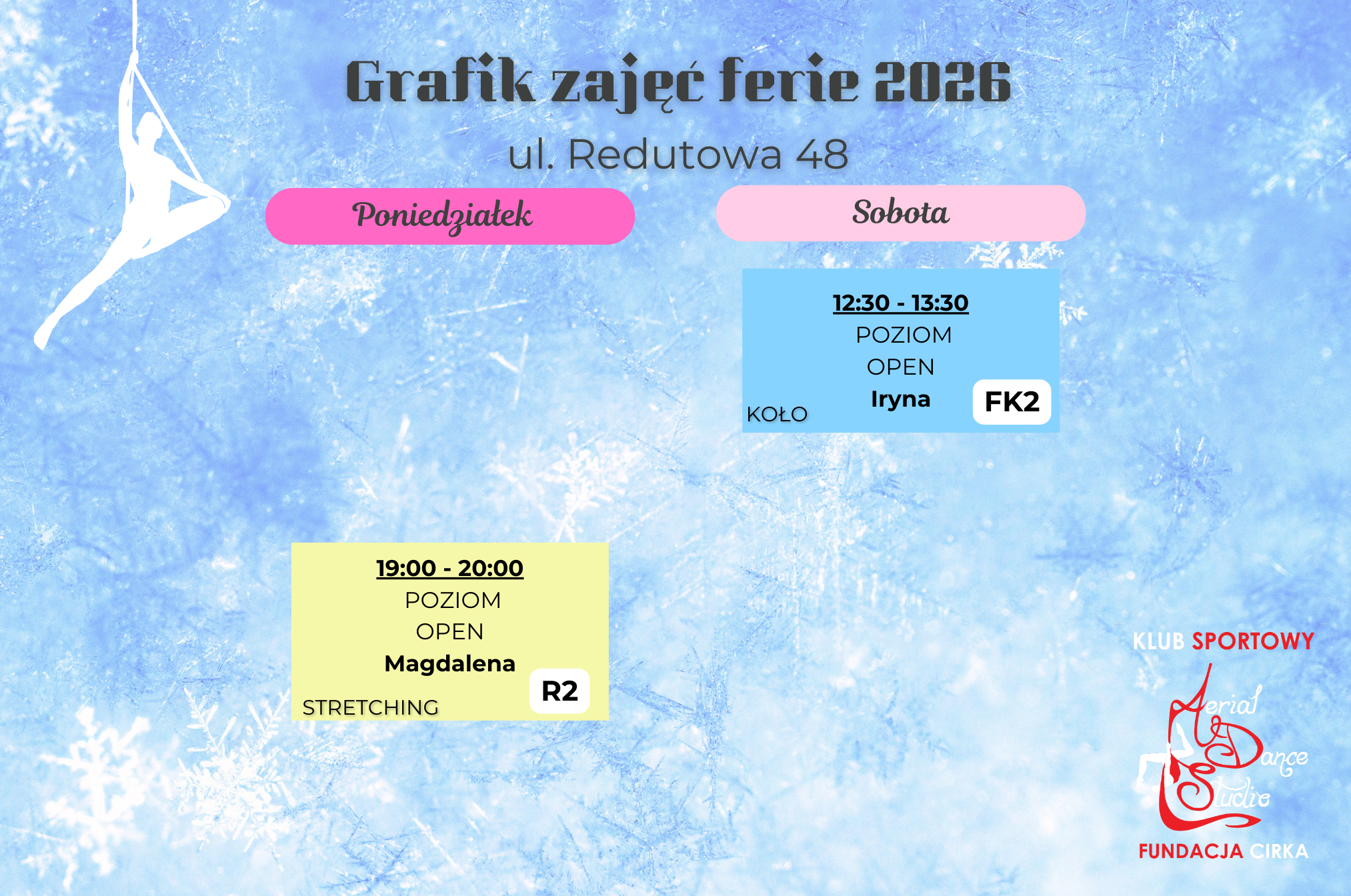 FS2 – grupa przeznaczona dla młodzieży i osób dorosłych kontynuujących naukę na szarfach na zaawansowanym poziomie (ul. Zwycięzców)