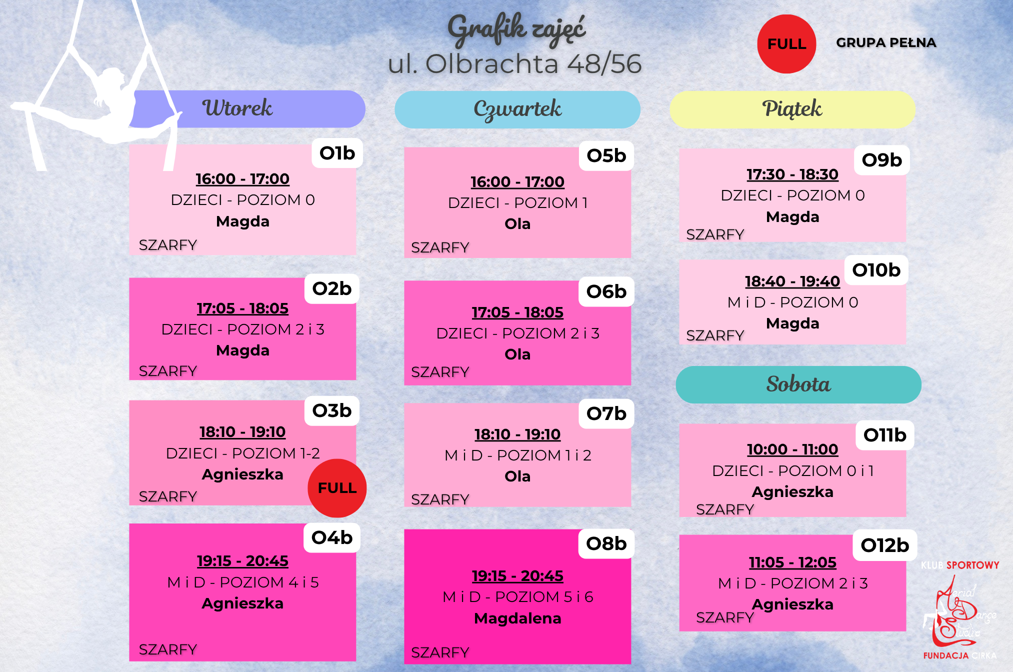 O8b – grupa przeznaczona dla młodzieży i osób dorosłych kontynuujących naukę na szarfach na bardzo zaawansowanym poziomie (ul. Olbrachta)